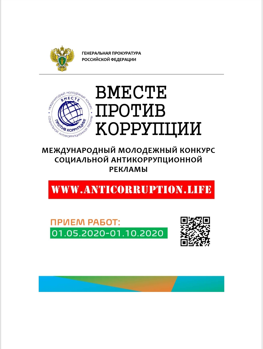 Генеральной прокуратурой в текущем году организован Международный молодежный конкурс социальной антикоррупционной рекламы на тему "Вместе против коррупции!" Проведение конкурса анонсировано на 8-й сессии Конференции государств-Участников Конвенции Организации Объединенных Наций против коррупции. Прием работ будет осуществляться с 01 мая по 01 октября 2020 года на официальном сайте конкурса http://anticorruotion.life по двум номинациям- социальный плакат и социальный видеоролик. (Правила проведения конкурса в разделе "Документы".)